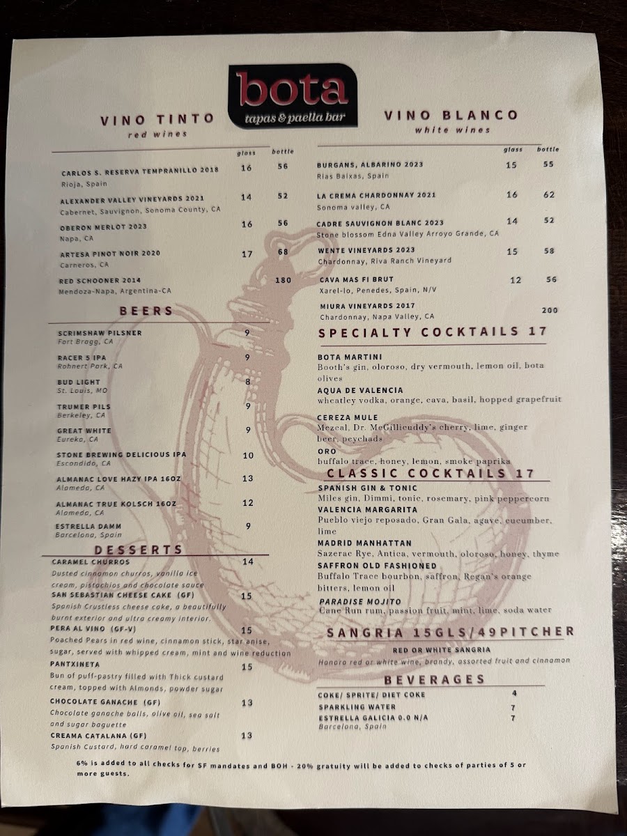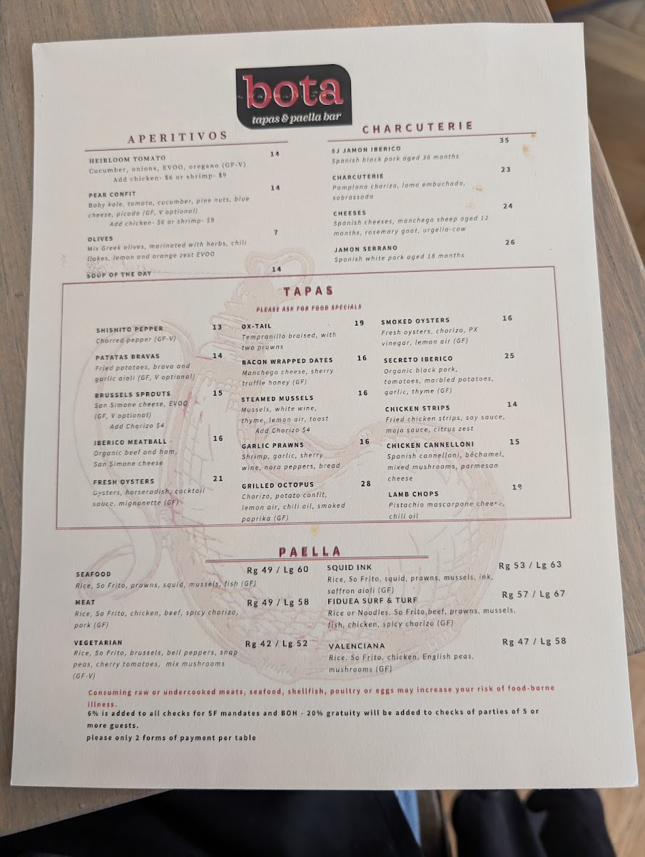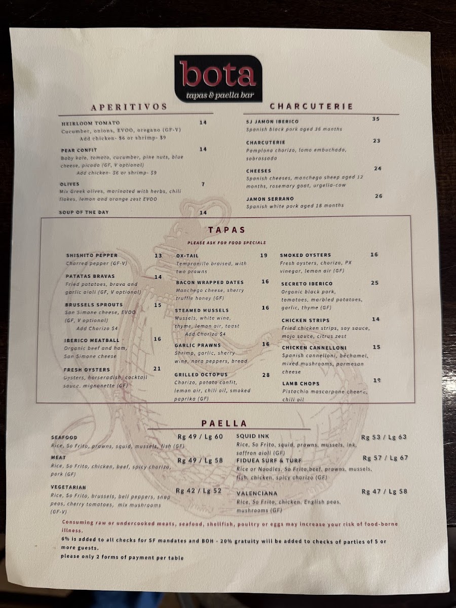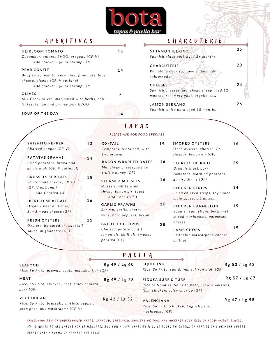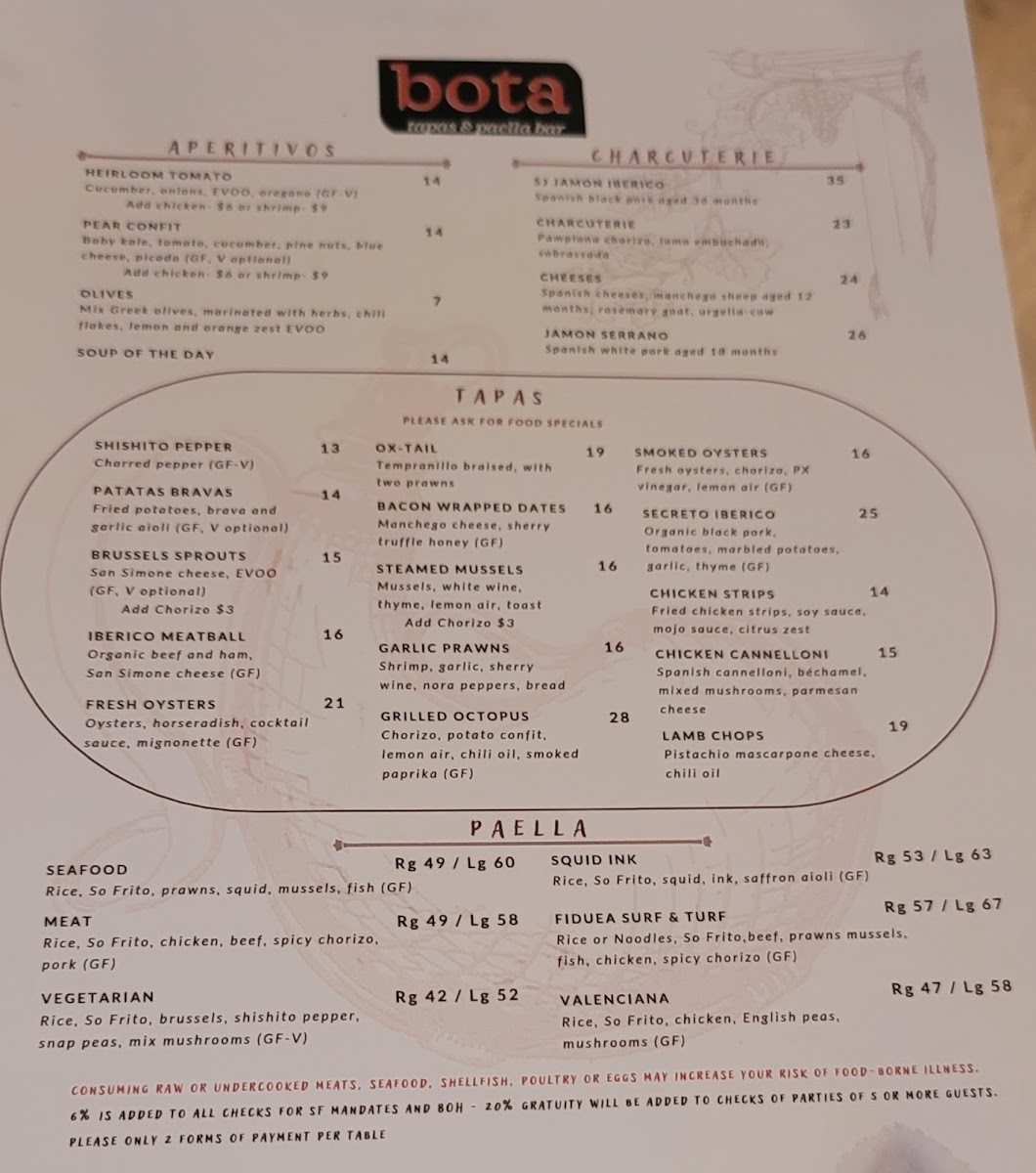 At Bota Tapas & Paella Bar Menu, you'll find a vibrant selection of Spanish-inspired dishes that bring a taste of Spain right to San Francisco. The menu is a celebration of flavors, offering everything from savory tapas to the heartwarming and aromatic paellas, making it a perfect spot for sharing with friends or enjoying a solo feast. Whether you're in the mood for crispy croquettes, succulent chorizo, or the rich seafood paella, each dish is prepared with fresh ingredients and a touch of tradition. You’ll also find a variety of salads, grilled meats, and vegetarian options, all served with the kind of attention to detail that makes each meal unforgettable. Located on Geary St, this cozy yet lively spot is perfect for anyone looking to enjoy a laid-back, delicious meal with a Spanish flair.