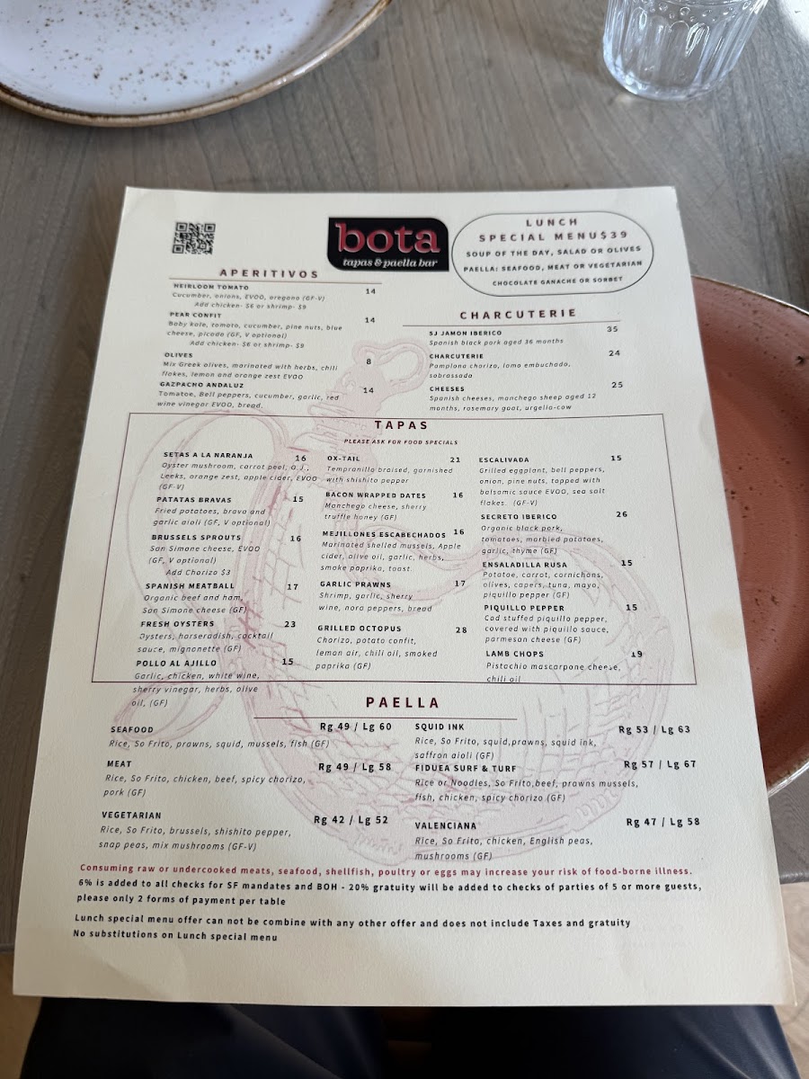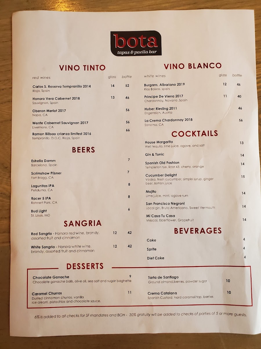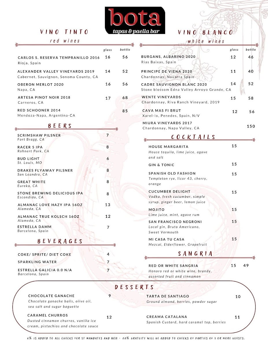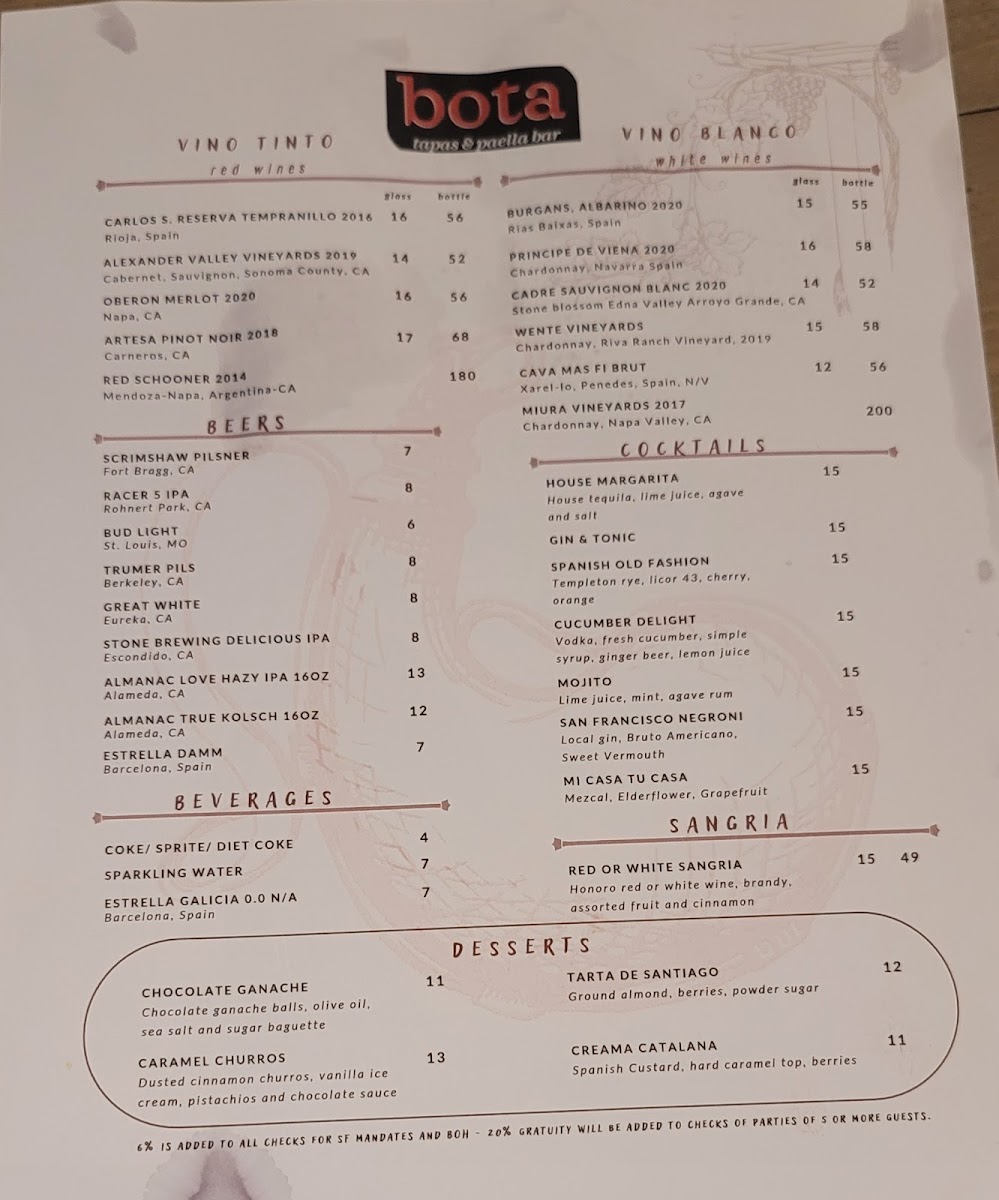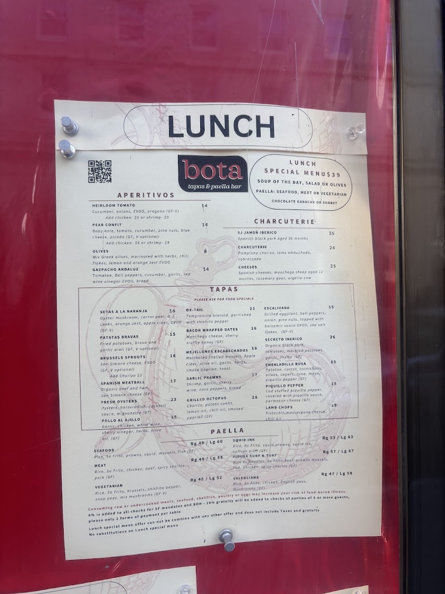 At Bota Tapas & Paella Bar Menu, you'll find a vibrant selection of Spanish-inspired dishes that bring a taste of Spain right to San Francisco. The menu is a celebration of flavors, offering everything from savory tapas to the heartwarming and aromatic paellas, making it a perfect spot for sharing with friends or enjoying a solo feast. Whether you're in the mood for crispy croquettes, succulent chorizo, or the rich seafood paella, each dish is prepared with fresh ingredients and a touch of tradition. You’ll also find a variety of salads, grilled meats, and vegetarian options, all served with the kind of attention to detail that makes each meal unforgettable. Located on Geary St, this cozy yet lively spot is perfect for anyone looking to enjoy a laid-back, delicious meal with a Spanish flair.